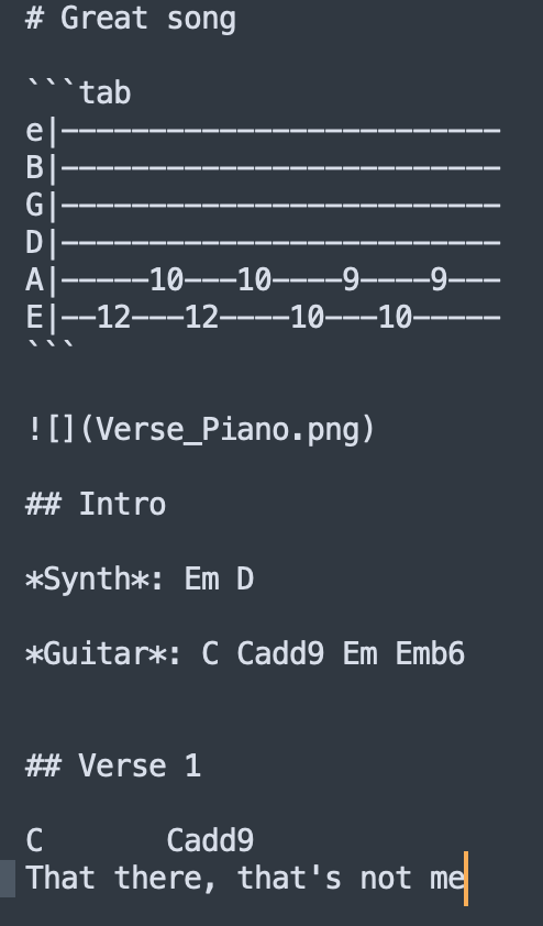 Tabs: You can write guitar tags by creating a ''' markdown block